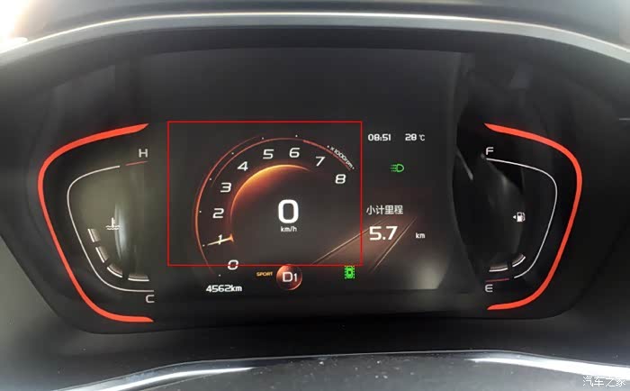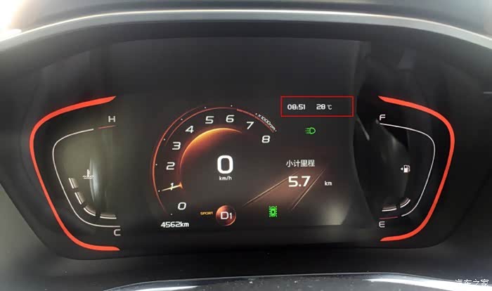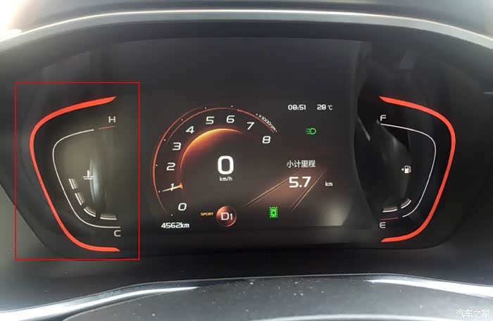运动模式下仪表盘是红色的,显示的图标位置也有变动。最左侧还是水温表。