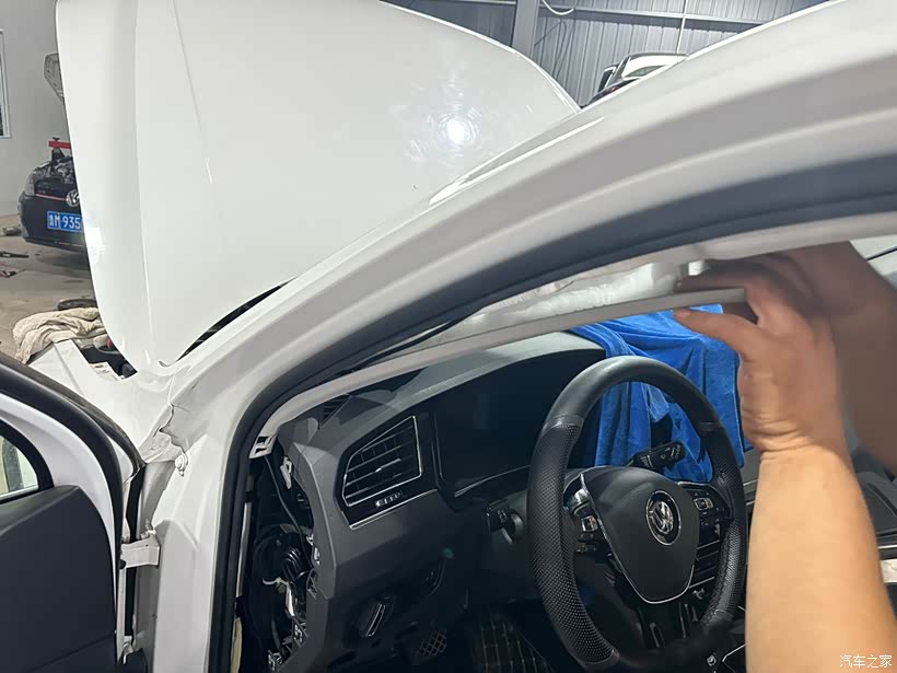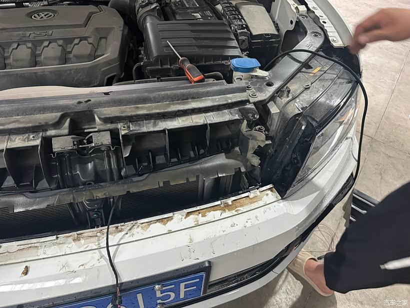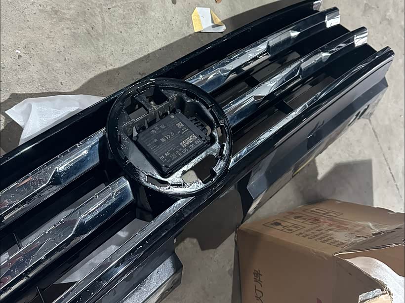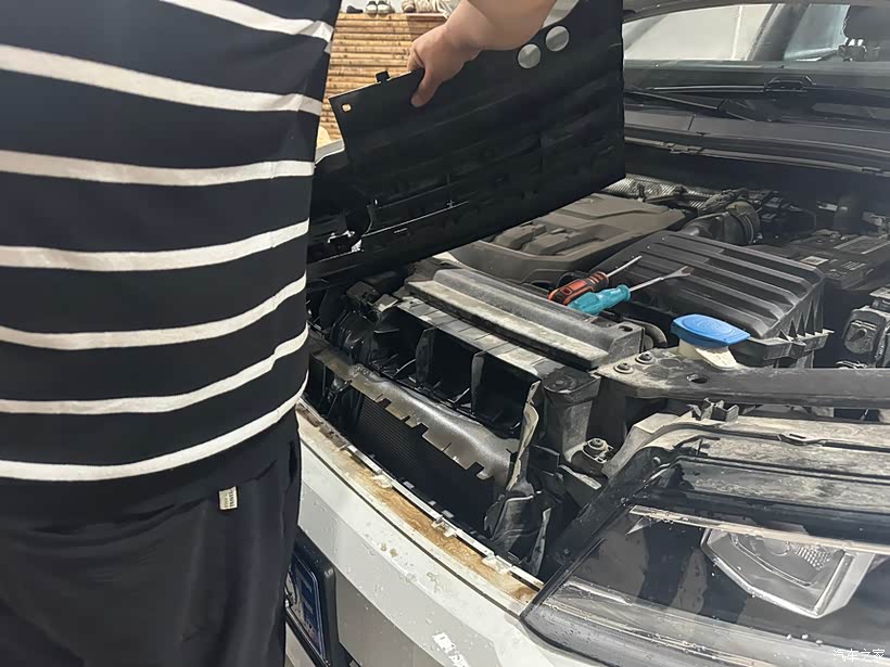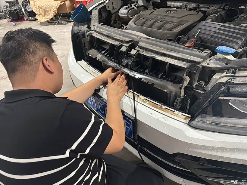 一大早我就把车开到了改装店。改装的第一步是拆除车子中网,摘下原先的大众标。因为雷达探测模块需要安装在这个位置,所以必须先拆下来。这一步看似简单,但其实需要非常小心,以免损坏中网,车标到时无所谓因为需要更换新的车标。