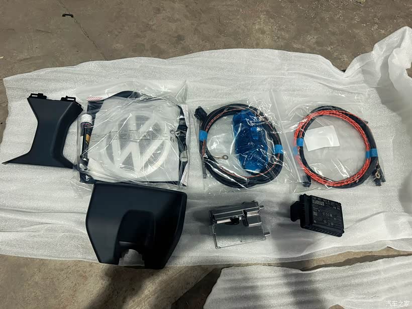 新的VWlogo标、雷达探测模块及专用线束、方向盘按键和离手模块、前挡风玻璃摄像头、车道保持加装盒、底涂药水以及模板、固定胶水