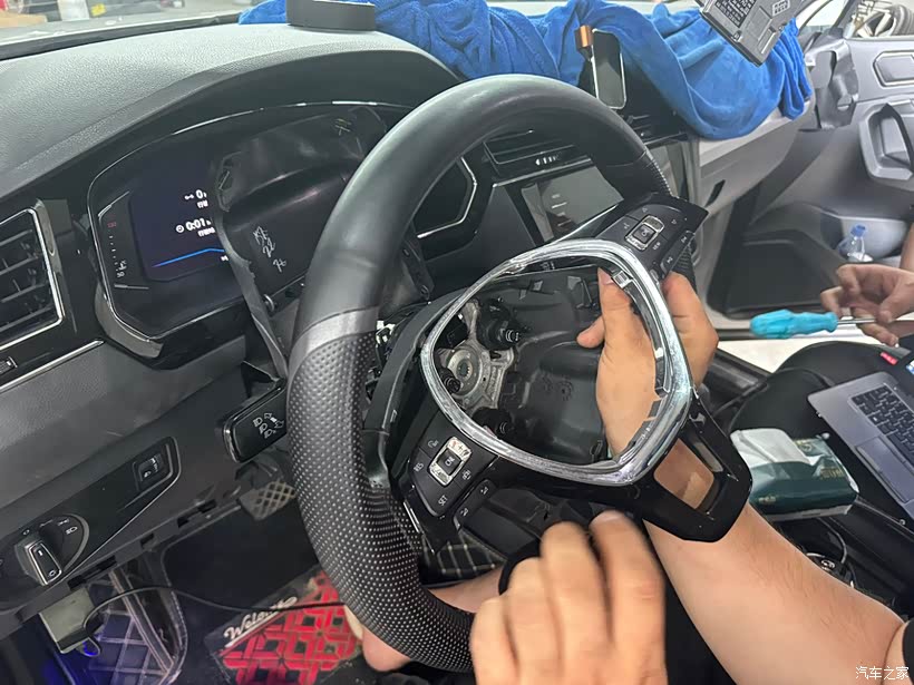 由于原车的方向盘没有ACC和车道保持功能的按键,所以需要更换新的方向盘按键。这一步特别需要注意安全气囊,师傅处理得非常小心。他先拆除了方向盘,然后更换了新的按键,最后重新安装方向盘。整个过程非常顺利,没有对安全气囊造成任何影响。