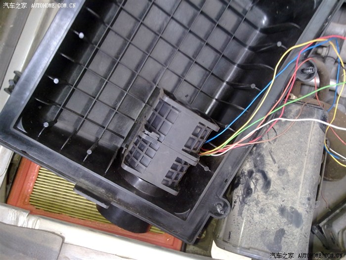 这是空滤的盖子,进气口本来就有个轨道,估计原来就是为风扇设计的,只是这轨道上宽下窄,然后是左低右高,装的时候需要把风扇底边两个角内层磨薄一点,然后高的那轨道削掉一部份,盖子底下两个槽的横条需要磨掉两根.反正是只要底边跟出风孔对齐了就好了,再用玻璃胶密封好,别让它晃就行了..风扇那么多线在买风扇时卖家会帮你弄好正负线,其它线一般用不到,作用到最后再说一下,