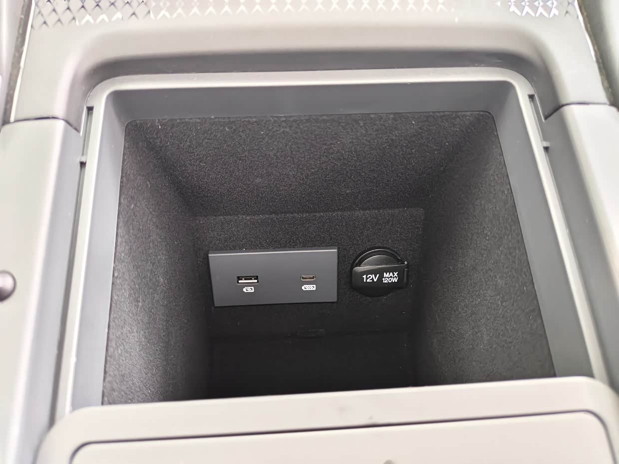 这款车的前排数据线插口和点烟口是在手扶箱里面的,但是盖上手扶箱的盖子不会影响数据项正常往外延伸。