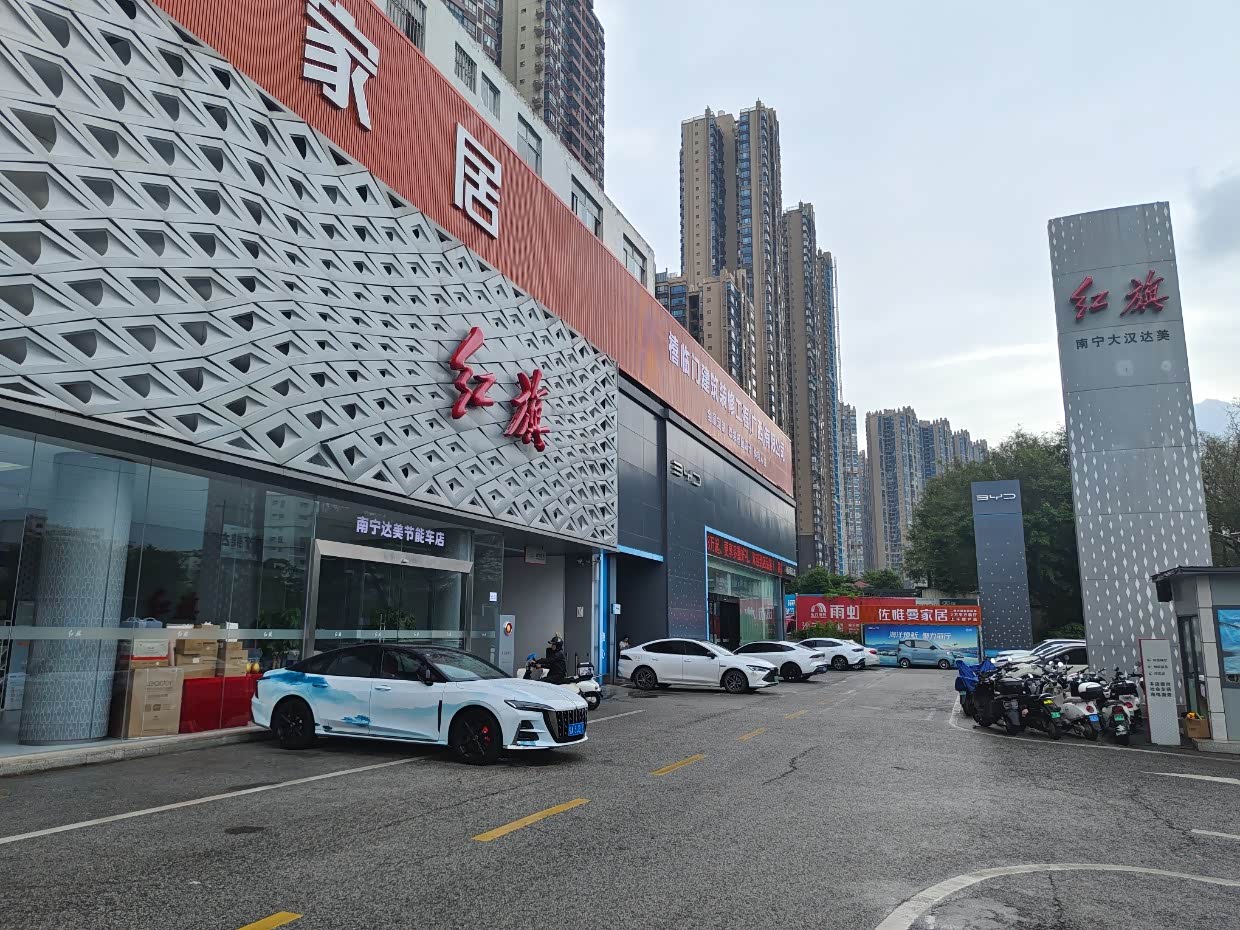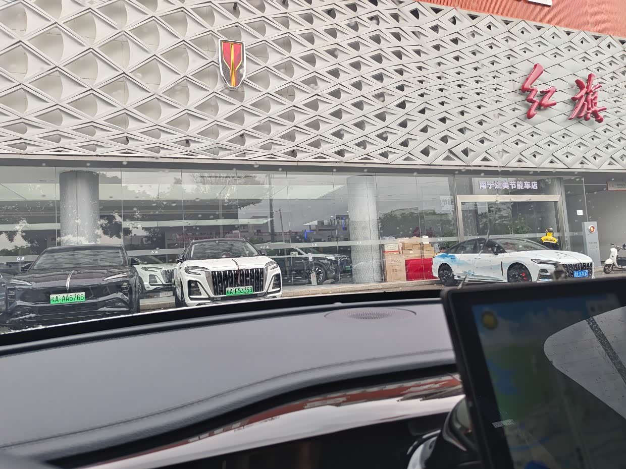 开着我的比亚迪秦到红旗4s店来看车了,销售小哥说这家店是全广西最大的一家红旗4s店,这里所有的车型都有,试驾车也都有,所以我驱车近20公里,过来一探究竟,到达门店的那一刻,在心中感叹,这一刻我离红旗那么近。本来我想着挑一个晴天过来,但是看最近的天气好像都是雨,今天上午天气还是不错的,谁知道刚刚出发没多久就下雨了,而且离目的地越近的时候下得还越大,心里想着雨天也好,能更好的测试车子性能。