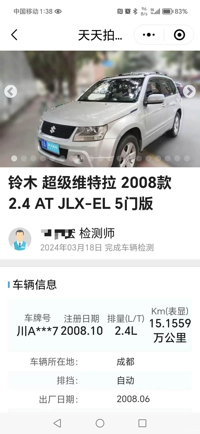 成都地区出一台08款2.4顶配超级维特拉,灰外黑内,08年上牌,20万公里,车主本人很爱惜车!车况良好