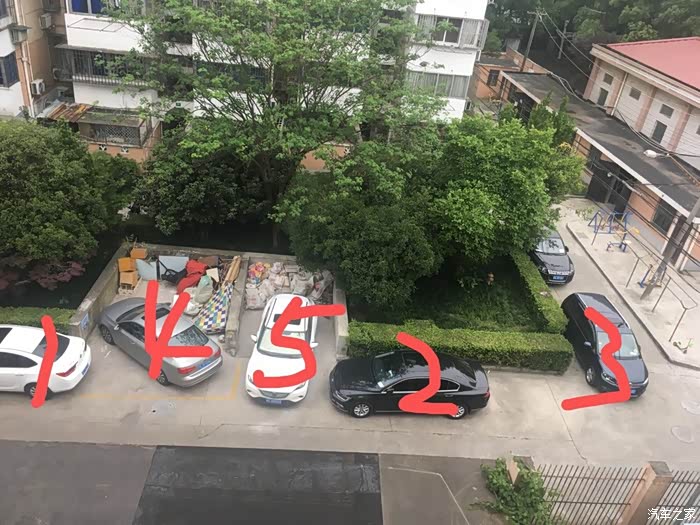 老旧小区一个角落停车情况,停车顺序数字标出了。3的位置之前一直是一辆白车停,每次都是缩在小路口里面的,换成黑车就停这样,少停一辆车。有个疑问,如果5不动4出得来吗?(左边路还剩不到一个半车宽。)