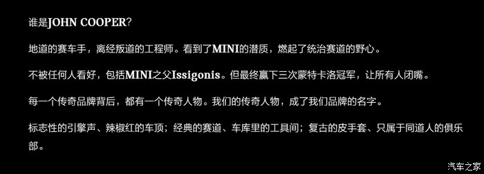 展台旁边还有可可爱爱的MINI子品牌 JOHN COOPER WORKS。这个对于我和很多人来说可能相对陌生,我在Mini官网也找到了他的由来,作为一名赛车手、工程师,作为赛道的一代传奇人物,也意味着 JOHN COOPER WORKS会更倾向于运动改装!