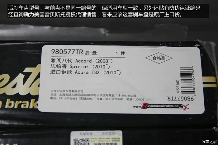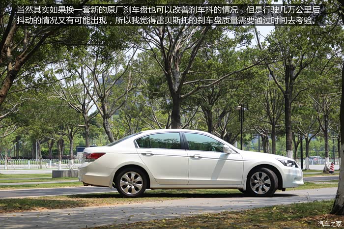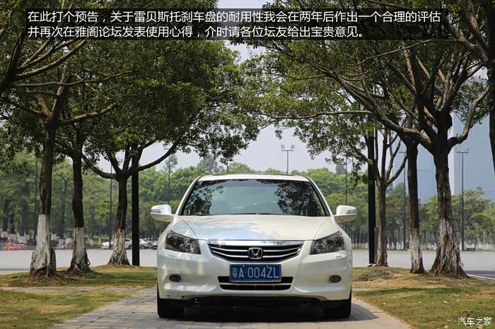 各位家家众测论坛和雅阁论坛的车友,您们好!欢迎阅览本期雷贝斯托刹车盘的体验评测,雅阁八代车型的原厂刹车盘受限于材质问题,容易发生过热变型,继而抖动的情况相信坛内许多的同学都已经遇到过,我的车型是2011年2.4EX,无可避免的在一年多4万公里左右时候就遇到了,当时4S店给我光了盘,抖动略有减轻,到三年8万公里保修期到期前,实在忍受不住,让4店向厂家进行索赔保修,更换了一套新的,抖动完全消失。现在五年多12万公里,抖动再次出现,但估计是因为听取了4S店当时的建议,减少高速运转后洗车,所以抖动的情况并没有4万公里时候那么明显和突兀,但是长此以往原厂刹车盘还是解决不了问题,所以更换一套刹车盘才是彻底解决的可行之道,这时候刚好发现家家众测的频道有雷贝斯托刹车盘试用,赶紧申请,幸运中签,就有了以下这篇试用体会。