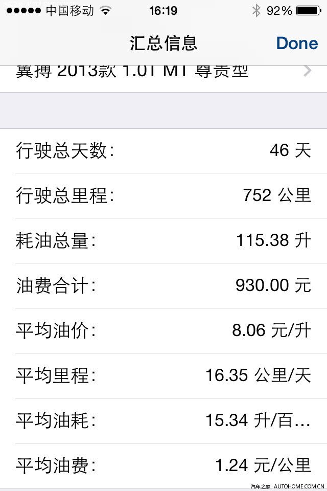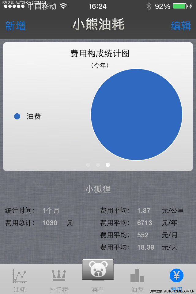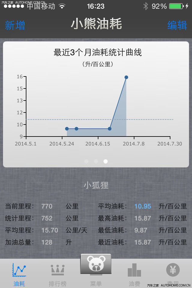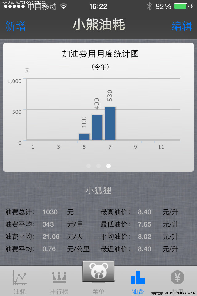 小熊油耗算的。0.76元每公里