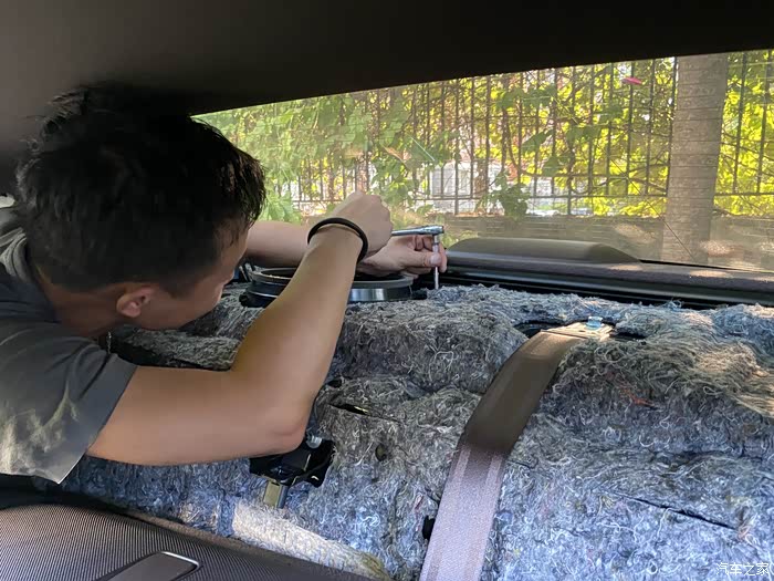 (6)此时可看到后平台低音炮。松开四个螺丝,取下插头,低音炮即可取下。原车四个螺丝孔距为245x220x210x220