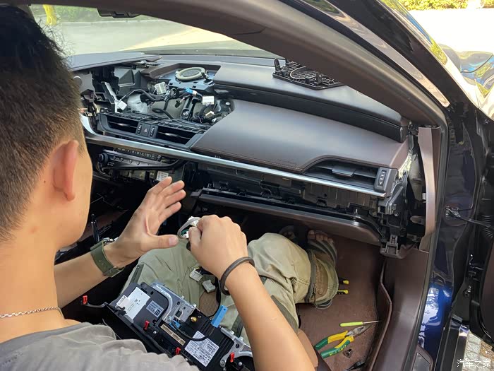 (2)中置喇叭因为位置比较宽敞,先翘左边,因为右边有光线感应,连着线束,翘起来线也不需要摘掉,直接换上喇叭即可