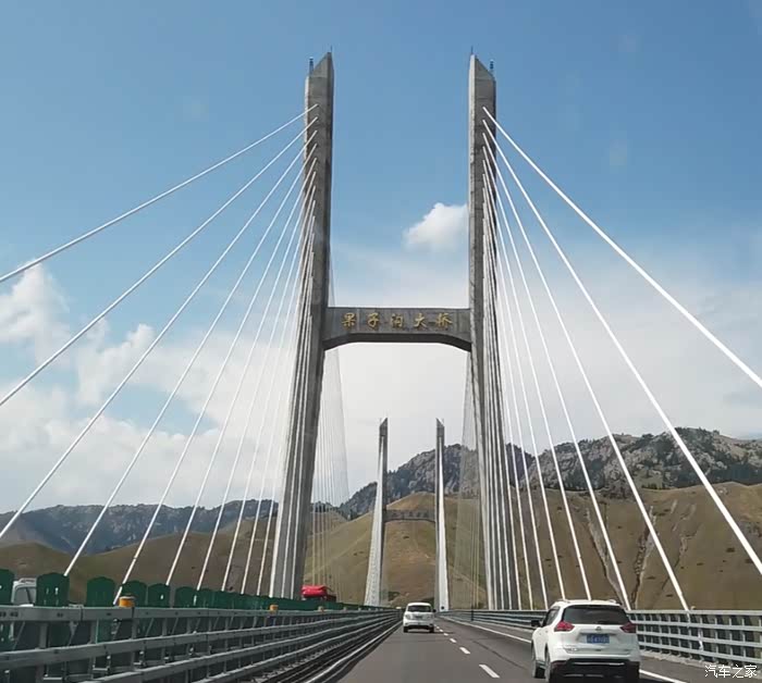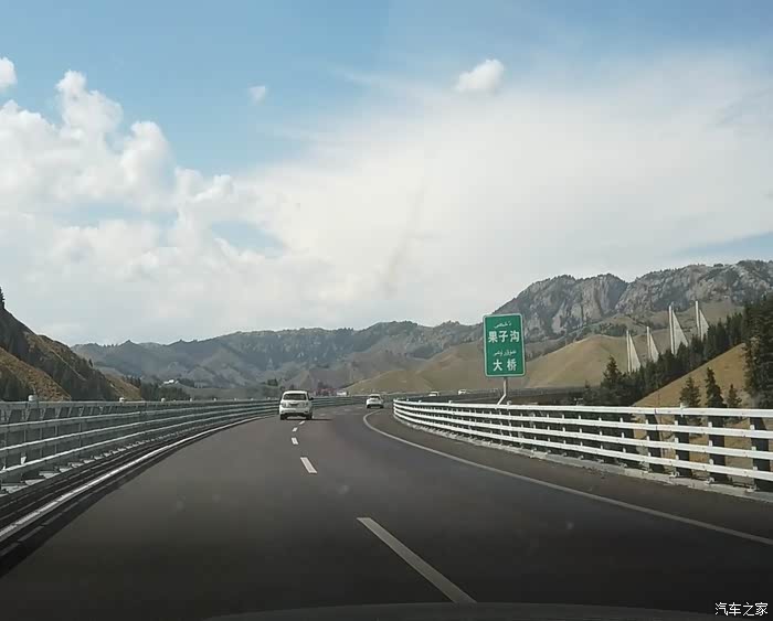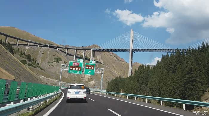 穿过隧道之后,我们已经在果子沟大桥之上。群山也无法阻挡前进的步伐,你就在山巅穿行,还能看到大桥对面的高架桥,说是高架,和城市里那些几十米的高架桥各不一样,这里的高桥最高的桥墩接近两百米