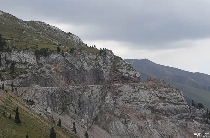 乌孙山同属天山山脉,山不高,道路极险峻,一边是峭壁,一边是深谷。伊昭公路仿佛一条巨***盘旋缠绕在山体之上