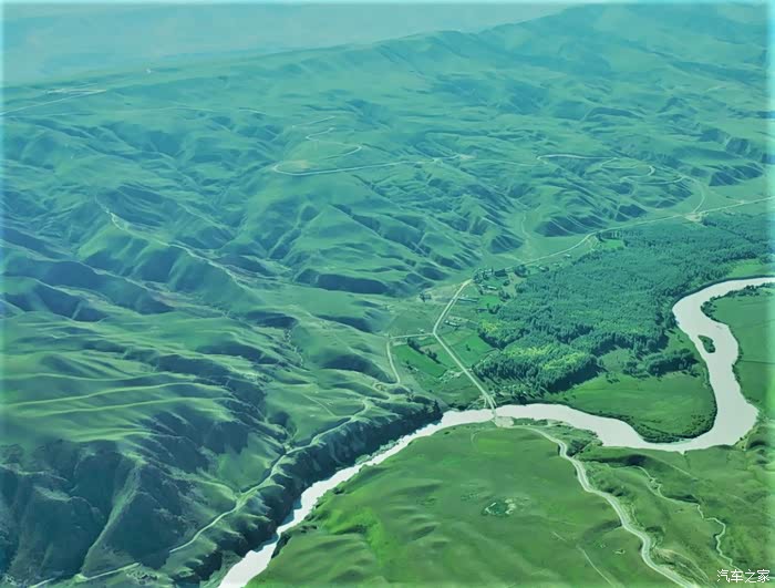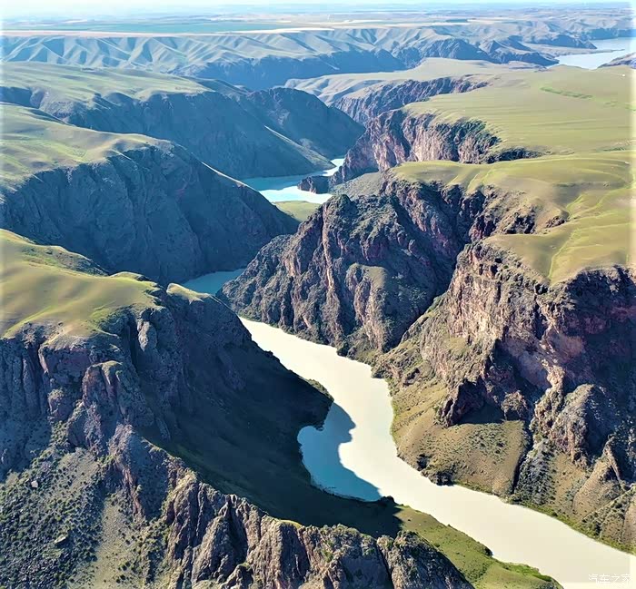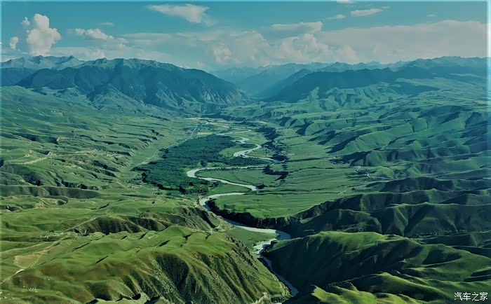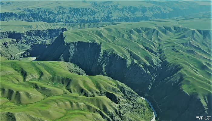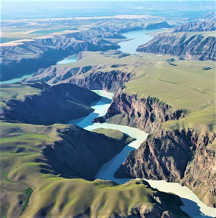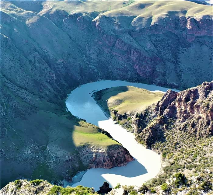 无人机航拍的阔克苏九曲十八弯,阔克苏大峡谷内日的九曲十八弯是另一种美。这里的峡谷,突然变成宽广的平地,河流婉转流淌,形成了曲折的波浪形。整个九曲十八弯南北长约有5600余米、东西宽约有2000余米。河流的拐弯处,大多是青青草场,加上十八弯的尽头是蓝天白云,因而从高处看十八弯,画面特别美