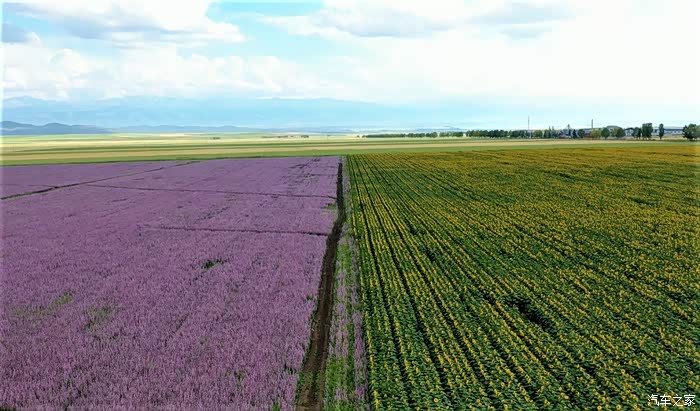 在昭苏千里花海,一边是金黄色的油菜花,一边是紫色的紫苏花。那样的美,也只有亲自站在那里,才能感受到