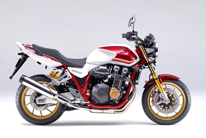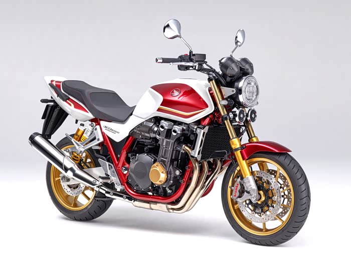 2023款CB1300 Super Four SP与CB1300 Super Bol' DOR SP在原有的基础上主要区别在于减震采用Ohlins制品,刹车采用Brembo制品,在本次三十周年纪念版中我们可以看到除了运用与首代CB车型相同的红白涂装以外,车架也改为红色,前后轮毂、磁电机外壳、前减震则搭配金色的配色,更显三十周年纪念版特有的质感。