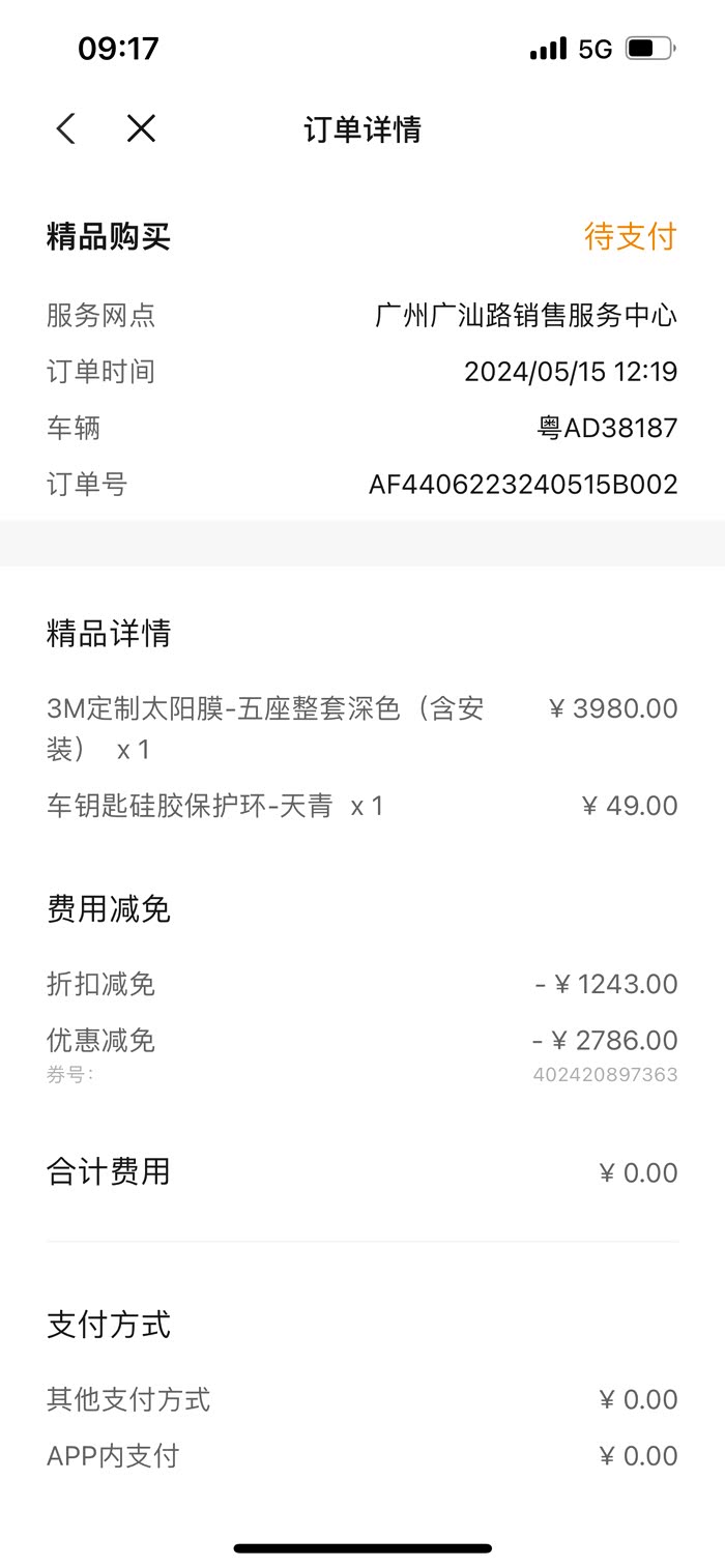 确定之后,售后提前给下单,我用积分兑换了相当数额的售后代金券,发给售后核销后等待太阳膜到货。5月15日预定,5月22日通知我随时可以去售后施工啦,还是挺快的!
