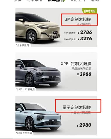 小鹏商城上适合G9的太阳膜有3种,3M定制太阳膜、量子定制太阳膜和XPEL定制太阳膜。XPEL有点小贵,于是在另外2款中进行选择。经过咨询客服,3M定制太阳膜和量子定制太阳膜原来都是3M的,量子款说是国外进口。以下是售后给发过来的参数图。