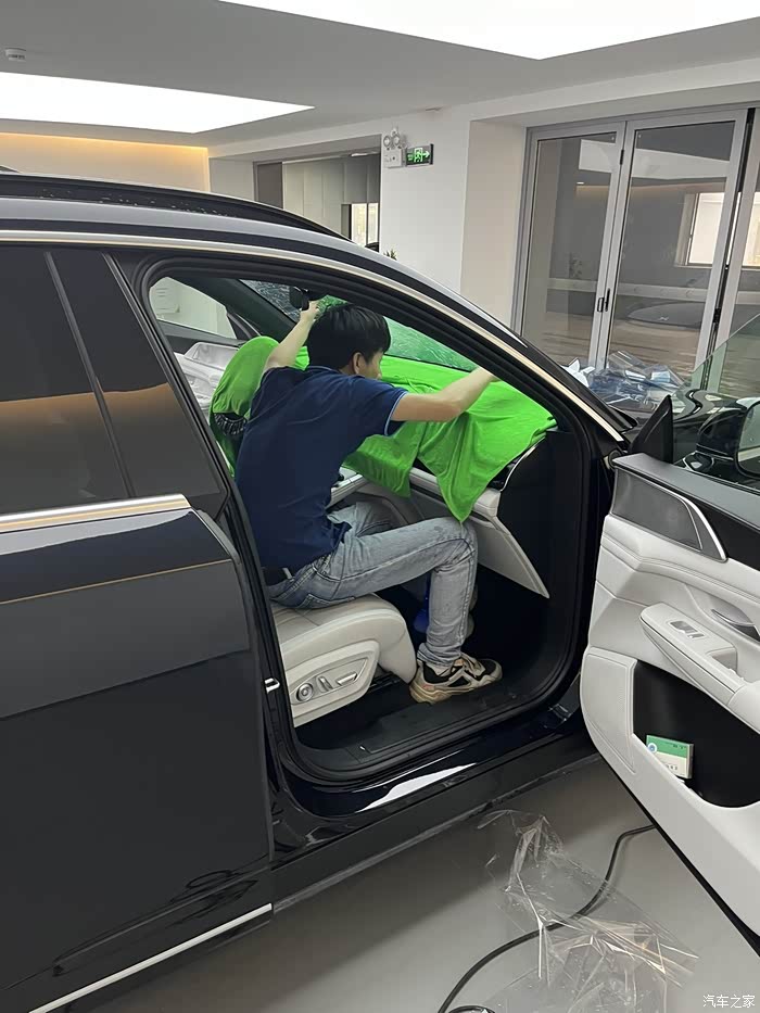 按照约定好的时间9点到达,车子太脏售后免费给清洗了车辆,尤其是玻璃。9:40开工,中午12点搞定,全程2个小时多一点,还算挺快的。贴膜是在一个封闭的交付区施工的,应该是售后维修区比较大的灰尘。