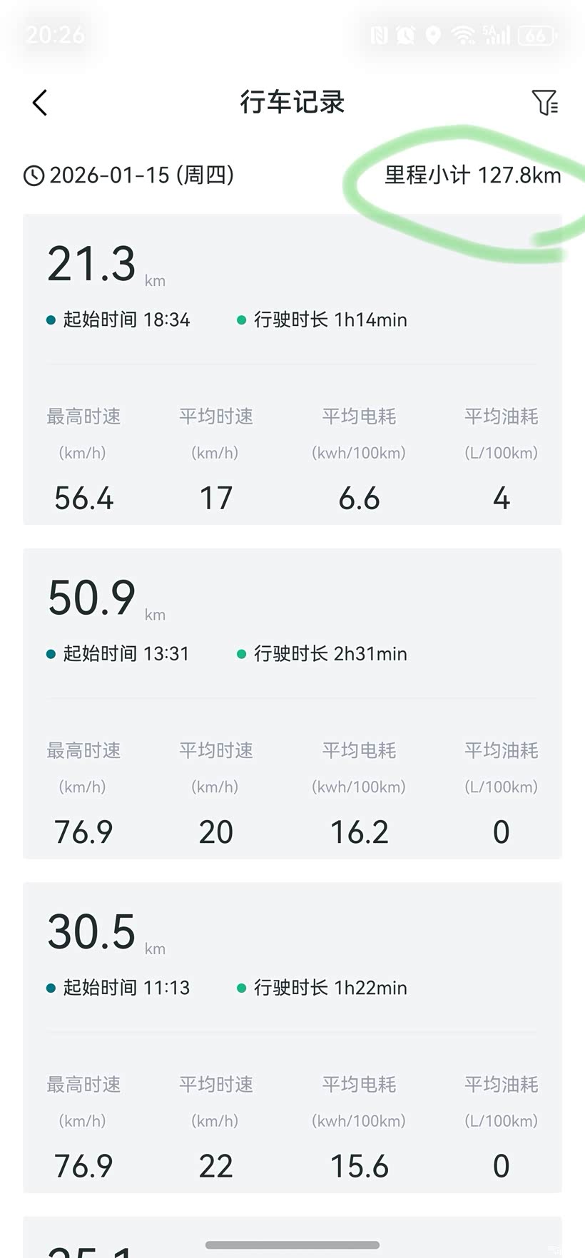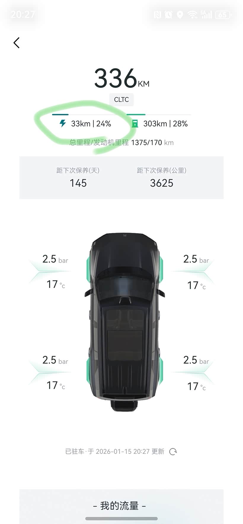 今天纯电行驶了127公里,电量还有24%,预计还能行驶33公里。