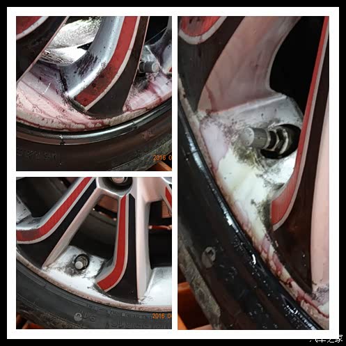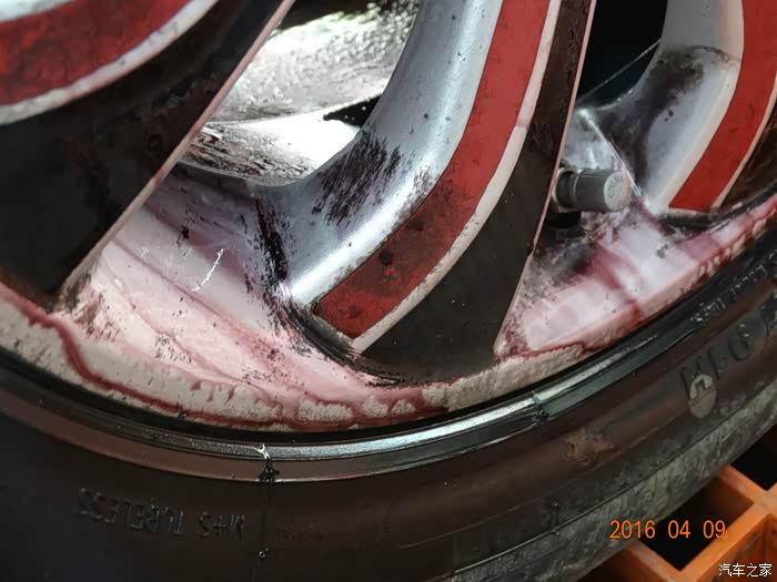 看看轮胎真的很脏,清洗剂在分解隐藏的污垢,都变颜色了。