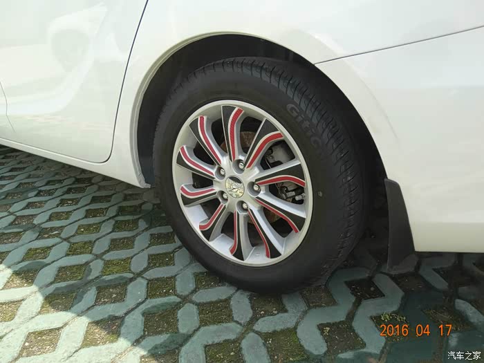 先从轮毂轮胎开始,这边是是像样的一面,轮毂依然很亮,轮胎的光泽度已经有点暗淡了。(好几天没动车了,请各位看官忽视那锈迹斑斑刹车盘