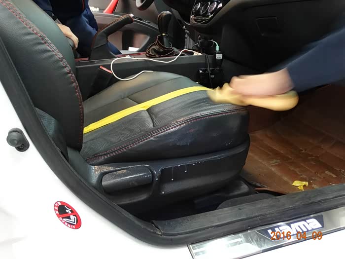 第一步先喷清洁泡沫,黄色的线是对座椅做个分界线。