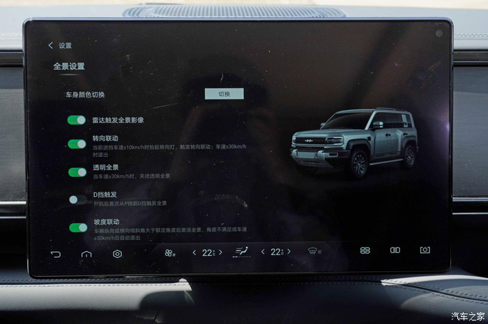说起停车,豹5的全景影像也是一个利器,系统可以设置一些特别场景下触发全景功能的开关,比如转向联动、坡度联动、挂D挡触发全景影像等等,总之很多情况下都可以用全景影像观察周边的环境,在开车的过程中确实会更有安全感。