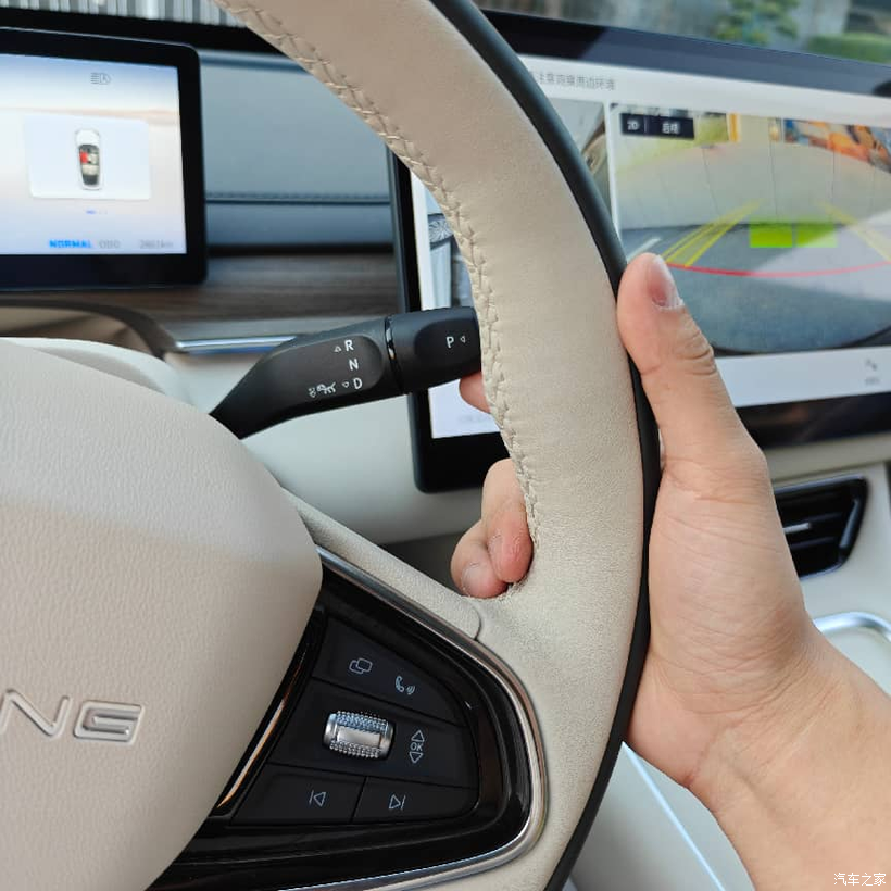 方向盘就是比较常见的双辐方向盘,尺寸不算大,手刚好能握住,手感还可以,右手的位置可以勾到怀挡,位置设计都是刚刚好的状态。