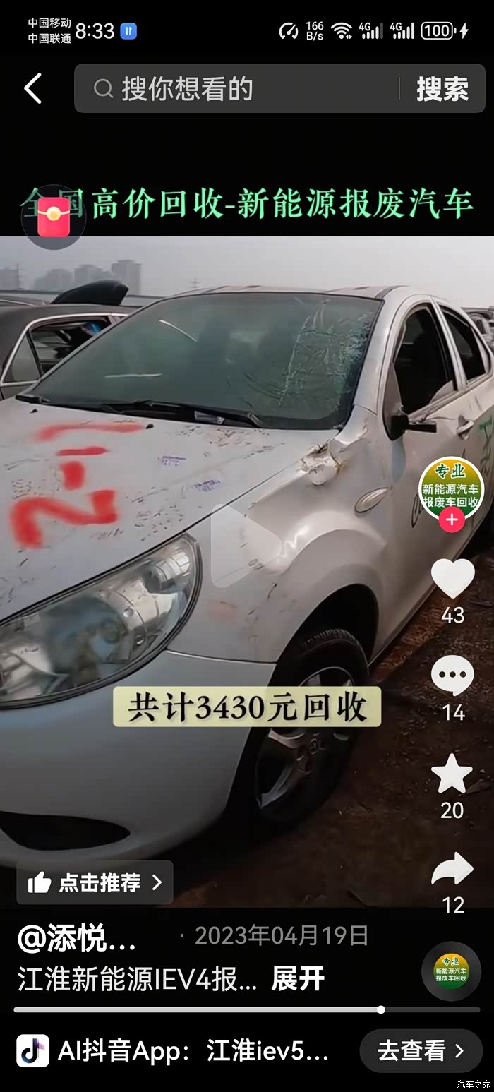 江淮IEV4和IEV5报废真实价格。如果自己的江淮IEV还能跑就先用着吧。明年国家对新能源有了更加严格的2025国标。等着吧现在今年出的新能源汽车一定会清库存。价格上应该会和现在跑了十年八年的二手车不错什么价格了。到时候去报废就是性价比最高