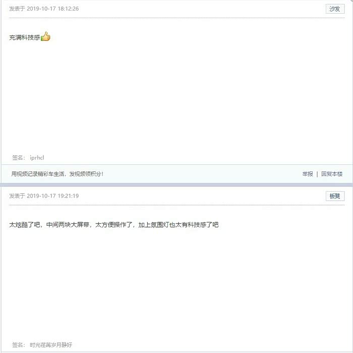对于视觉上的科技感,大家可以看一下我之前发过的文章,屏幕,氛围灯,营造出了一个有点科技,有点温馨,又有点时尚的内饰氛围,至少网友们的评价都还不错!