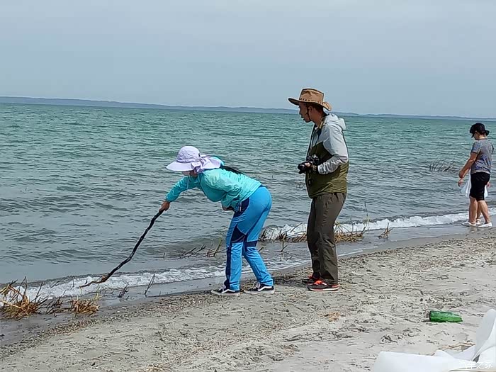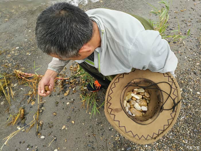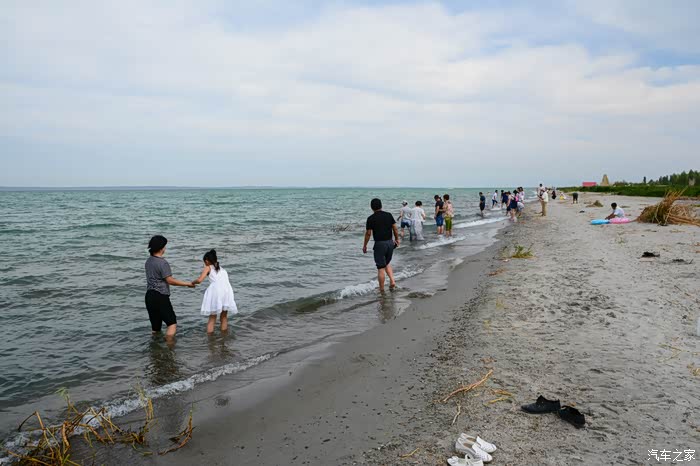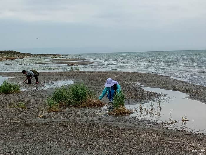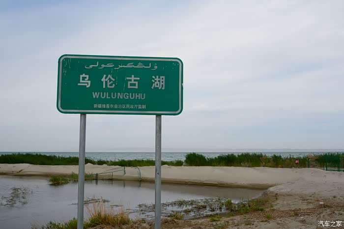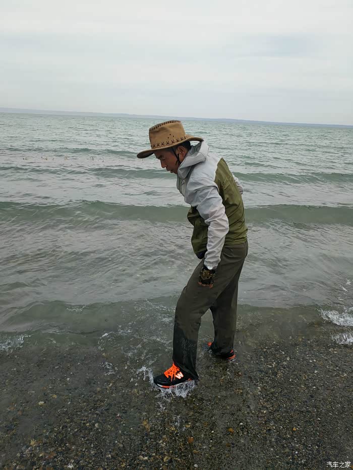 乌伦古湖地处北屯市以西、福海县城西北,吉木乃县、阿勒泰市居其西北。发原于青河县的大青河一路自北向南走的挺好,突遇大山变向西去,连名字都改成了乌伦古河,当其走到此地的地质大坑时,汇众集起一潭汪洋,因河名湖为乌伦古湖。乌伦古湖的东岸建起了景观园区,路过的我们一家没有进入,仅沿着环湖公路走走停停欣赏着没有被人收拾过的自然存在。芦苇河岔环湖四周,鱼禽众族依湖而生;破壳稚鸭摇行大道,鸟儿霸路鸣笛难驱;风起浪涌推石上岸,行人饥饿狗鱼入肚。虽然老天爷沉着脸不给力,但微风吹来,湖水天色反而彰显出其波澜本性。开车到湖的东南岸沙滩之上,在湖边戏水、捡石,贪性太大,见了所有被湖水带上岸的小石头,都觉得新奇、都是宝贝,甚至为捡一个石头,我差点陷入无底的泥淖里,好惊险!捡了许多小石头,没带装石头的兜子,我的牛皮帽子在此也派上了用场。