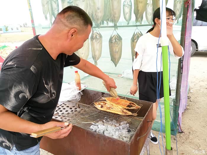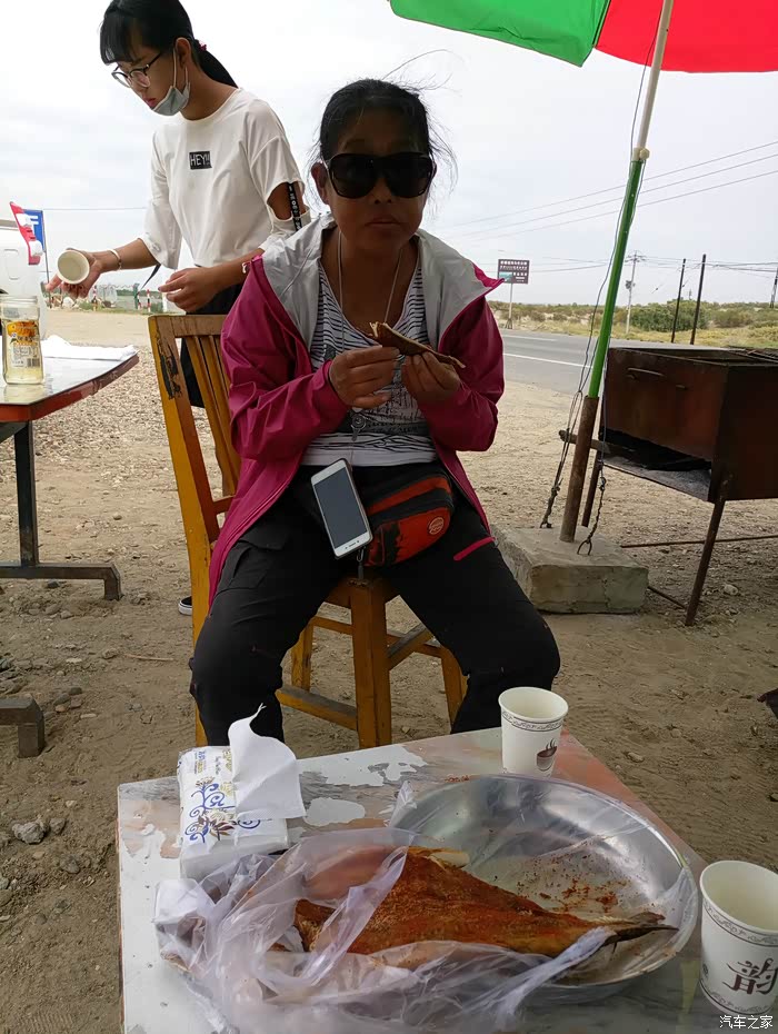 出了观赏性很强的湖区东南岸,路边有众多以鱼为主题的饭馆。在一家四川人开的烤鱼摊上买了条狗鱼,三人随即把它分食了,味道不错。狗鱼全称叫白斑狗鱼,也称乔尔泰,是一种冷水鱼,产于额尔齐纳河、乌伦古河里。吃过狗鱼,抹了一把嘴,启程,想环湖一周看看。