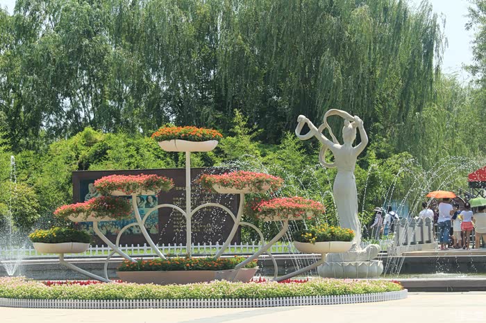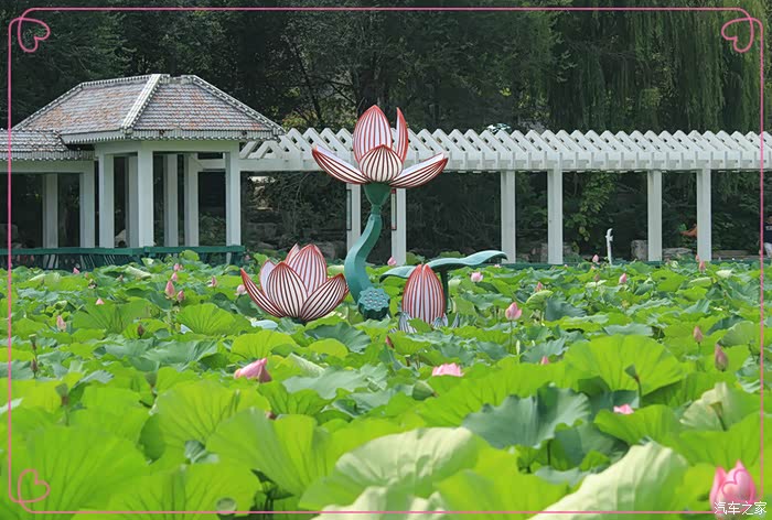 荷花池中央有一荷花造型,真假荷花相映相辉,好一幅优美的画卷!