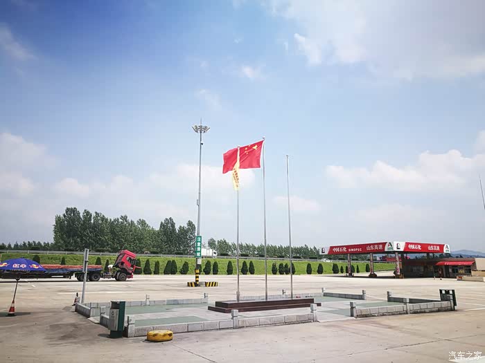 服务区的蓝天白云,国旗迎风飘扬,构成一幅优美的画卷。