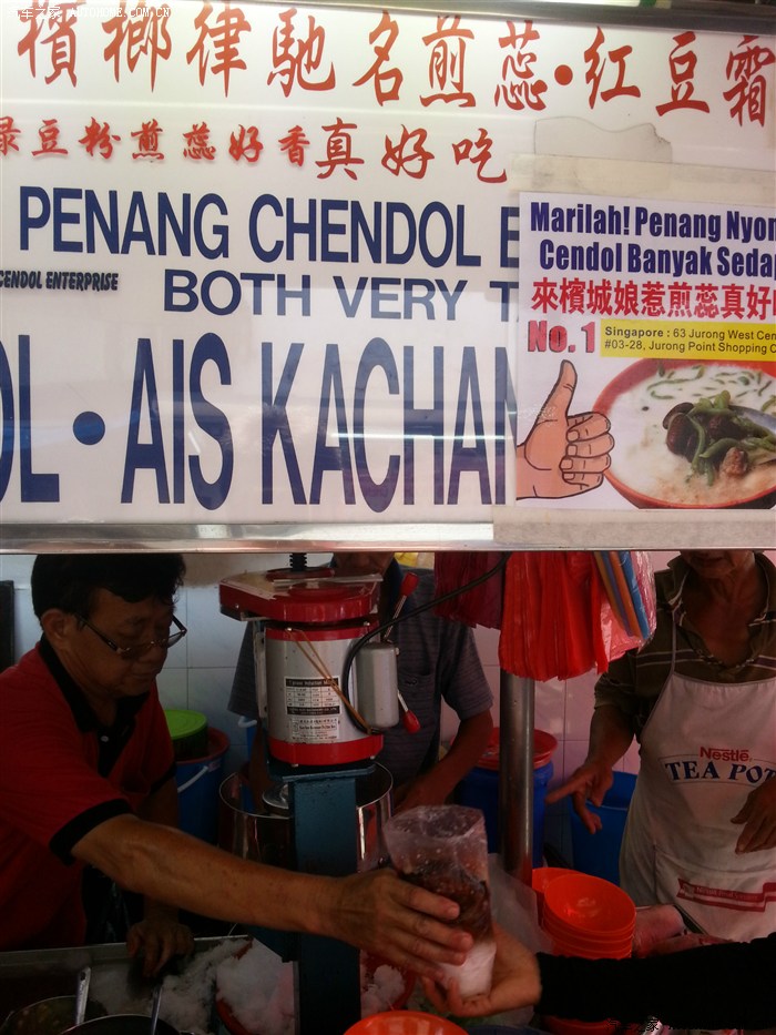 由于升旗山和附近的极乐寺都比较近,也是比较有名的景点,听说今年的晚上都会开灯,LP大人坚持要去,所以下山后到极乐寺的路上,点了碗Laksa(米粉,混着虾酱,薄荷叶,等香料,没吃过的可以一试,但估计大部分国内人士都不喜欢吃。),图中的是久违的青菜(带肉松的),右边的是本地的福建炒,其实就是炒米粉,但马来口味,还有两碗四菓糖,味道偏淡,但解暑功效可好了,很喜欢里面的荔枝肉,好甜,赞一个!!