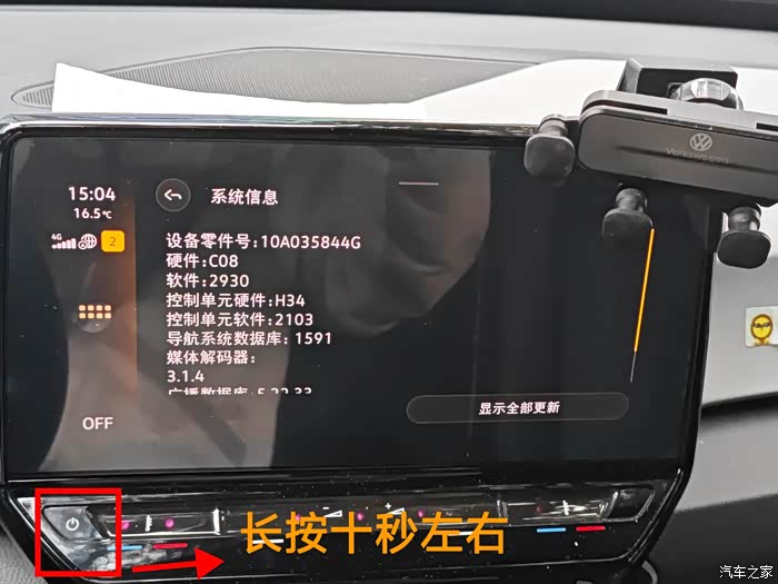 5.重新启动车机,长按车机电源键10秒,直到VW大众标志出现,这将重启车机系统,可能恢复网络连接。