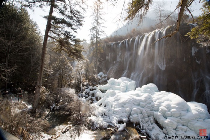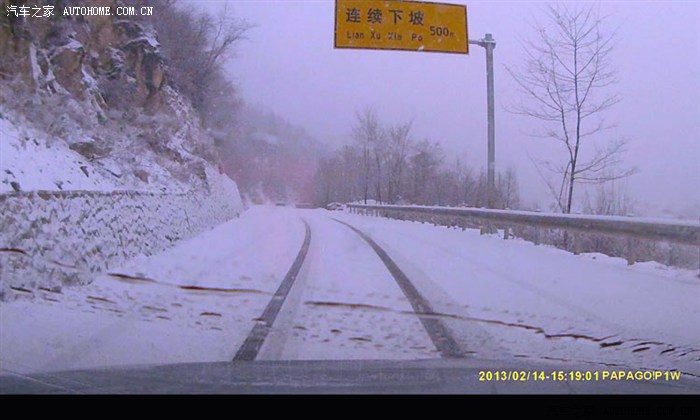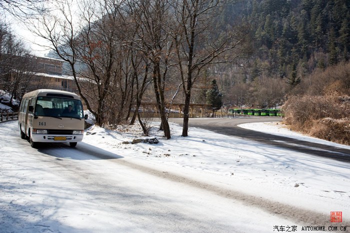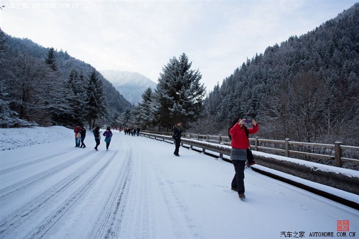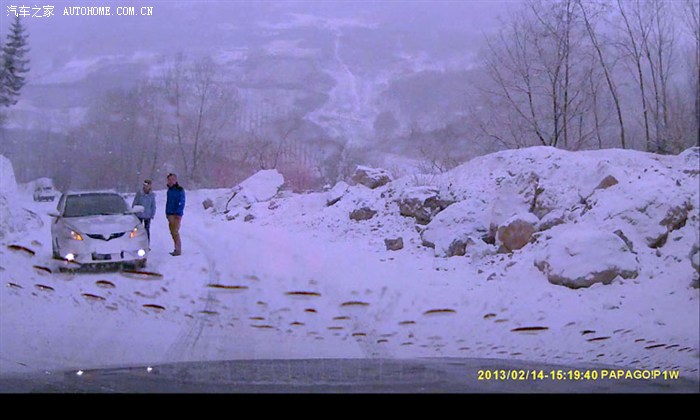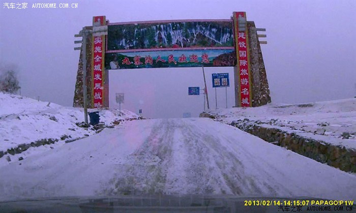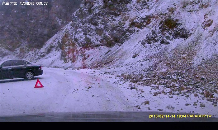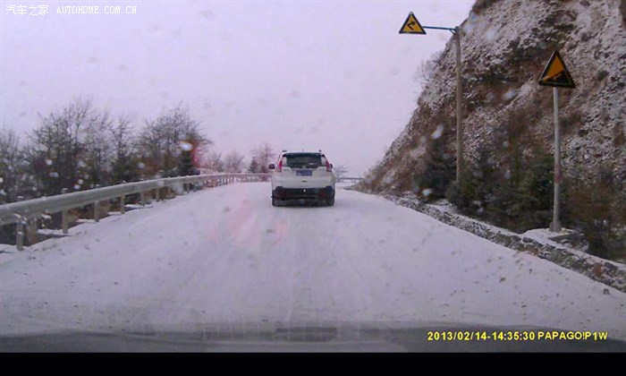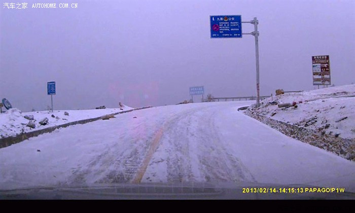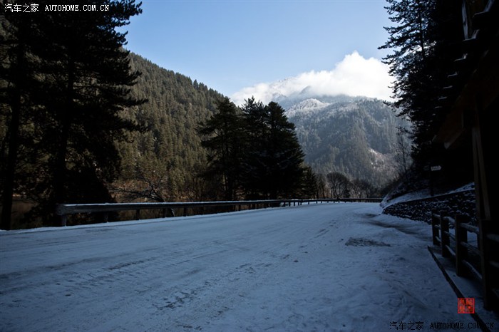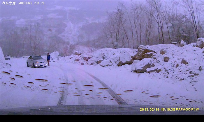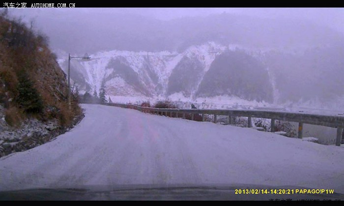 这条线路比汶川方向难走,“杯具”的是到黄土梁附近遇到了下雪,快到冰雪路面时,被路边的村民拦住,极力说服你用防滑链,原来他们是推销防滑链的。看着路边好几辆三马子上满载的防滑链,不得不佩服村民们的经济头脑,路边车辆逐渐排起了长队,车友们不知所措纷纷下车交谈。我拦下一辆刚下山的奥迪Q5,了解山上的路况,答曰:越野车可以通过,轿车费劲。与太太商量,如果绕行松潘县要好几百公里,路也未必好走。这时一辆当地牌照的骏捷FRV没用防滑链走了,我车上备了一幅防滑链,于是谢绝了村民们的好意,鼓足勇气冒险上山了,我的车是手自一体自动挡变速箱,便使用手动模式,档位2-3档,车速控制在30公里/每小时左右。关掉音响,集中注意力观察路面,谨慎驾驶。在雪地路面行驶还算顺利,遇到会车时及早靠边让行,偶尔点一下刹车,车辆都有一点顿挫的感觉,为了减轻太太的恐惧感,努力控制好车辆的行驶姿态。就这样有惊无险的到达了半山腰,突然发现前面过水路面结了大约30米的冰(路边停了辆客货车),半幅通车,我准备上冰面时对面来了3辆车,没办法只好停车让行。当我启动车辆准备通过冰面时“杯具”发生了,驱动轮打滑无法起步,这时从客货车上下来三人向我摆手,手里提着防滑链说必须装防滑链,我告诉他们不用,在上冰面时我观察到路边的雪下面是沙子,试着挂上倒档,倒档可以用,于是将车辆倒了1米试着起步,还是不行,再倒了几米终于成功起步了,在路边三个“好心人”的注视下我战战兢兢的通过结冰路面。遗憾的是这段行车记录仪记录的映像被覆盖了。