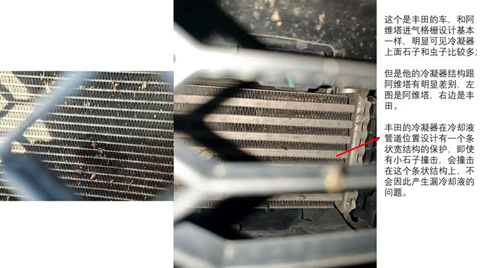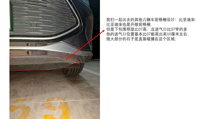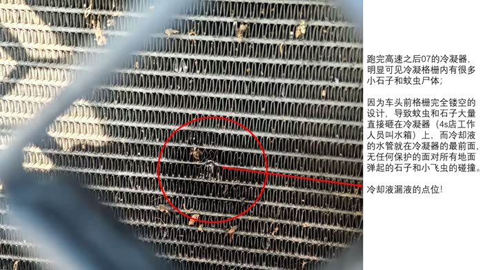 3、阿维塔07这个车的全脸进气格栅的设计绝对是设计失误!个人在8月25号车辆高速行驶中莫名的提示碰撞预警,之后所有的摄像头,车上的3d建模和智驾用不成,倒车影响也用不成;后来到4S店检修,说是可能有小石子通过进气格栅把水箱(冷凝器;就是一个像散热片的东西)打坏了导致冷却液漏液。换这个水箱八百多,工时费一千八百多,快三千。我才专门关注了下车辆前脸下面。坦白说,这个位置确实很容易会有小石子溅上去,但是只有阿维塔的设计会导致小石子直接撞在冷凝器上导致漏液。后面我把跟我们一起去海南自驾的其他车也发图出来,大家可以对比下。如果说阿维塔造车没经验,长安已经这么多年,真的连这么明显的设计问题都看不出来么?