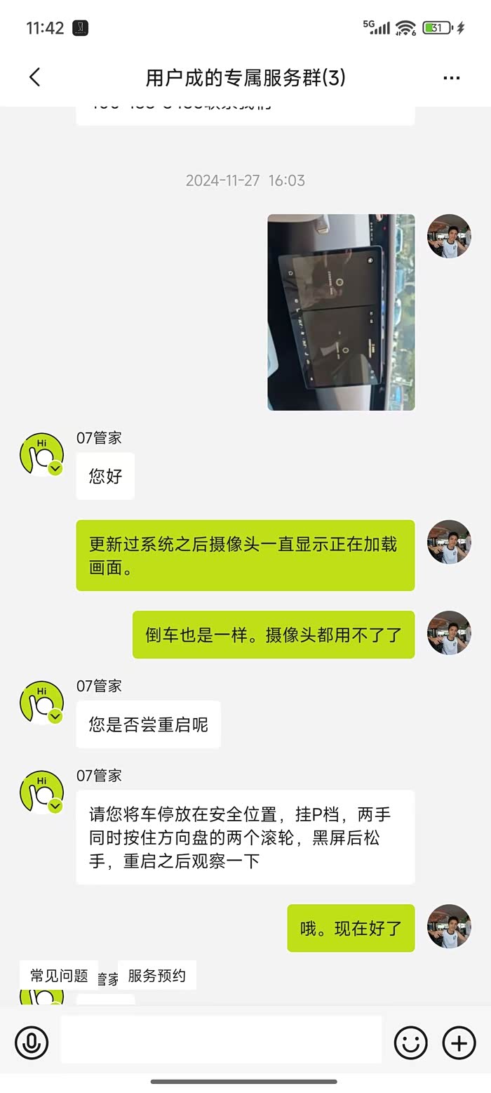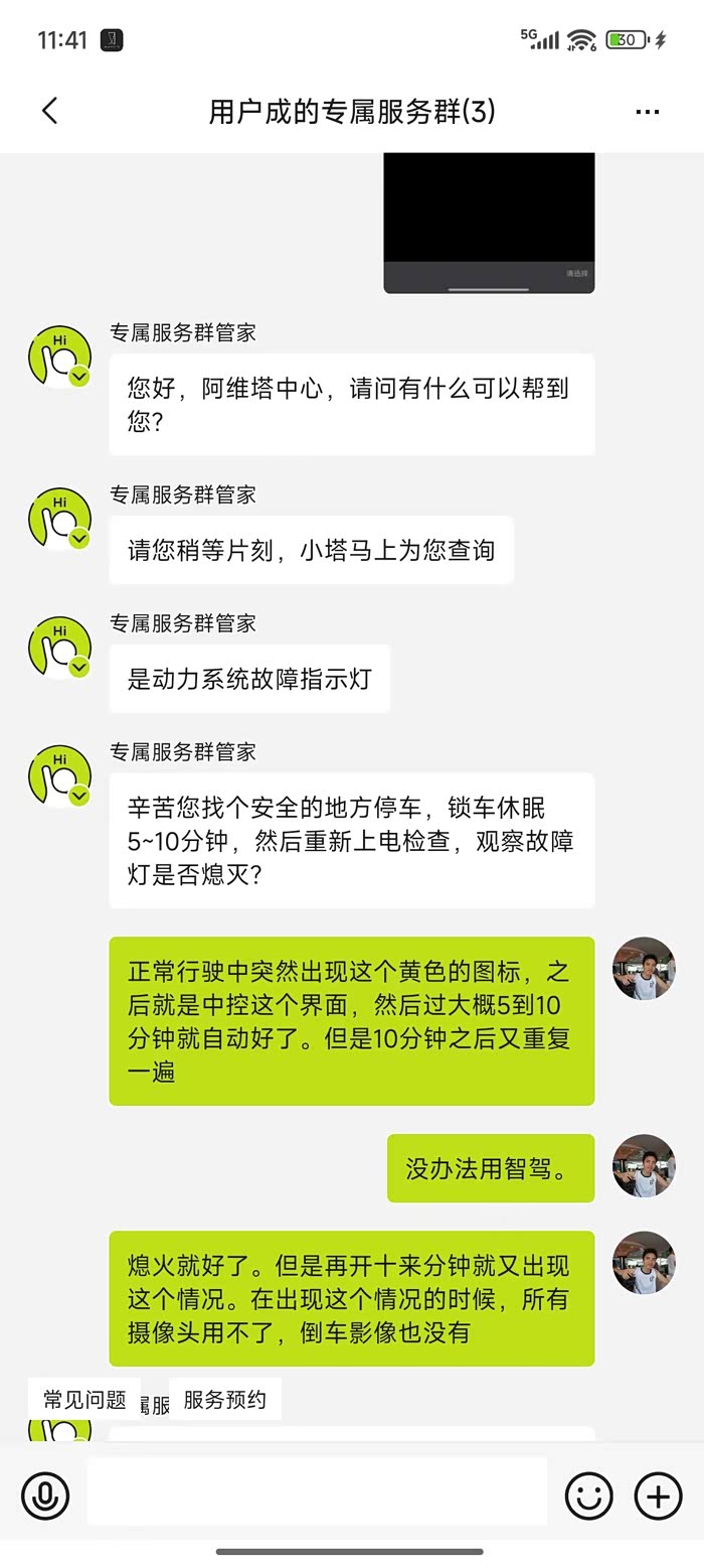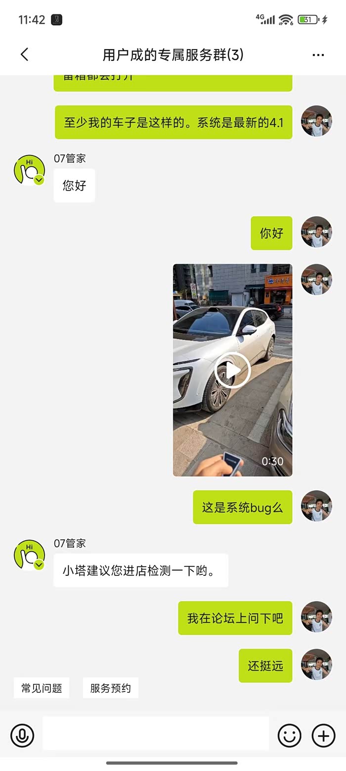 1、系统不稳定。在这10个月的使用中,至少有3-4次,下面是相关问题的咨询的图,车辆在使用中系统就崩了,然后按照官方说的方法重启下基本就好了,或者锁车再打开就好了。但整体感受很不好。有一次停车在一个小商店门口,外面坐很多人,车辆不知道为啥就在锁车后一直响喇叭(确定车门都关了,钥匙手机在身上),吵的几个大妈过来问我,我说车坏了,然后大家就说,国产电车就是这,小毛病多,整的还挺尴尬。但是离开那个停车场,一切就又好了。