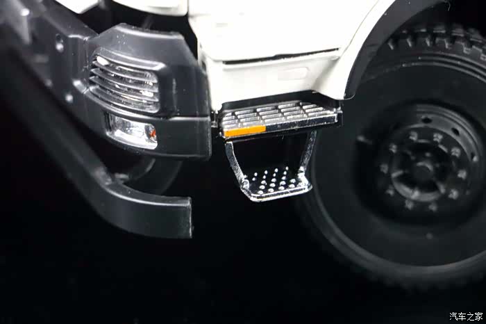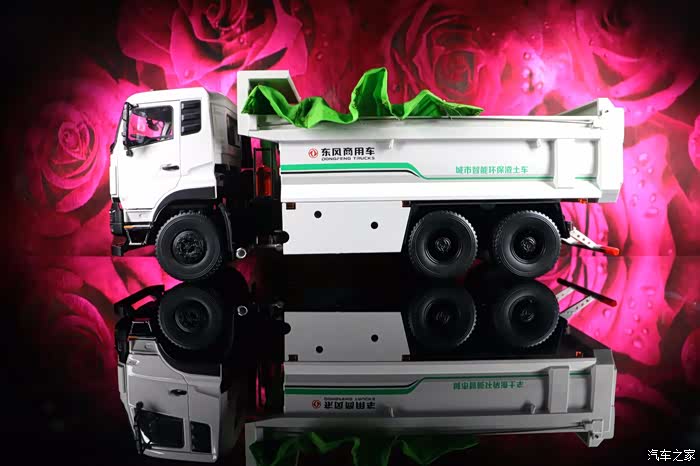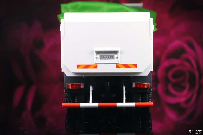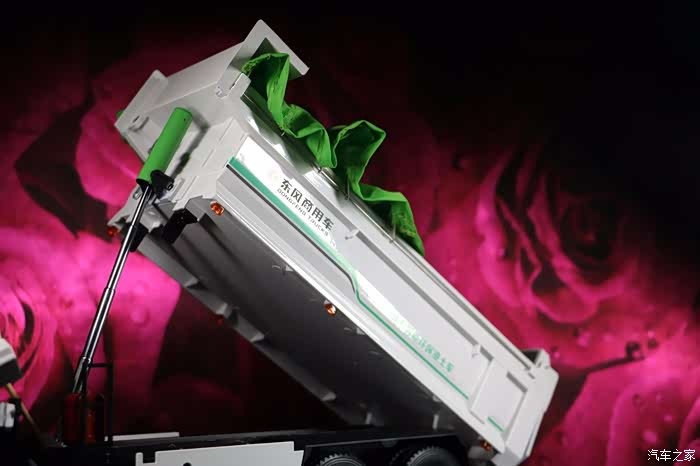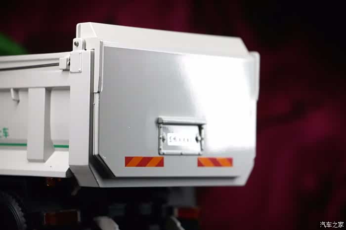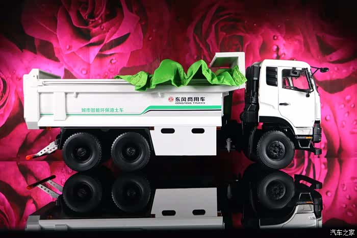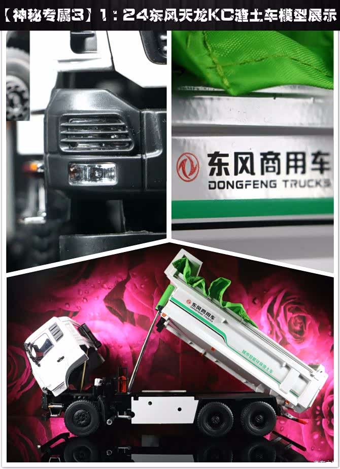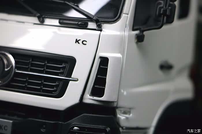 其实像这样的东风商用车模型我也有了解过,最开始有个32比例的东风天龙货柜车,但引文比例不符合我都收藏路线,就直接pass了,现在的24比例的新天龙拖头模型做工的确不错,但我认为花那么高的价钱只买到一个拖头,有些不值当,所以就把目光转移到了这种自卸车身上,我对自卸车的了解屈指可数,相比自卸车,我还是对乘用车更感兴趣。但是同样的模型收藏久了,就感觉没有新意,所以收了这样的大块头来尝尝新鲜,天龙KC渣土车这款模型上市也没有多久,但我感觉买的人比较少,不知道我分享的这次算不算是论坛首发呢?模型的做工是一流的,首先各种的小部件都是独立的,没有任何偷工减料的情况,前脸非常霸气,黑色的进气隔栅上镶嵌着东风LOGO,这也代表着东风对商用车制造的信心,车灯部位用到了保护罩,这是一个很贴心的设计,这么大的车辆盲区也很大,难免回出现剐蹭的情况,用到了保护罩既可以减少损失,还美观。三个雨刷均为独立件,两个后视镜,副驾驶的照地镜都完美地还原了出来,引擎盖开启后发动机的细节一般般,里面都是塑料材质,全黑色,前脸的情况大致就是这样,模型还原度非常高。可动件方面,这种自卸车的可动件几乎都会令我失望,两个车门可以打开,但开启角度不大,车头可掀起,后车斗可高抬,车斗上的篷布可活动,估计是阴天下雨才能用到吧,可动件暂时就是这些,精彩内容在下方,千万不要走开!