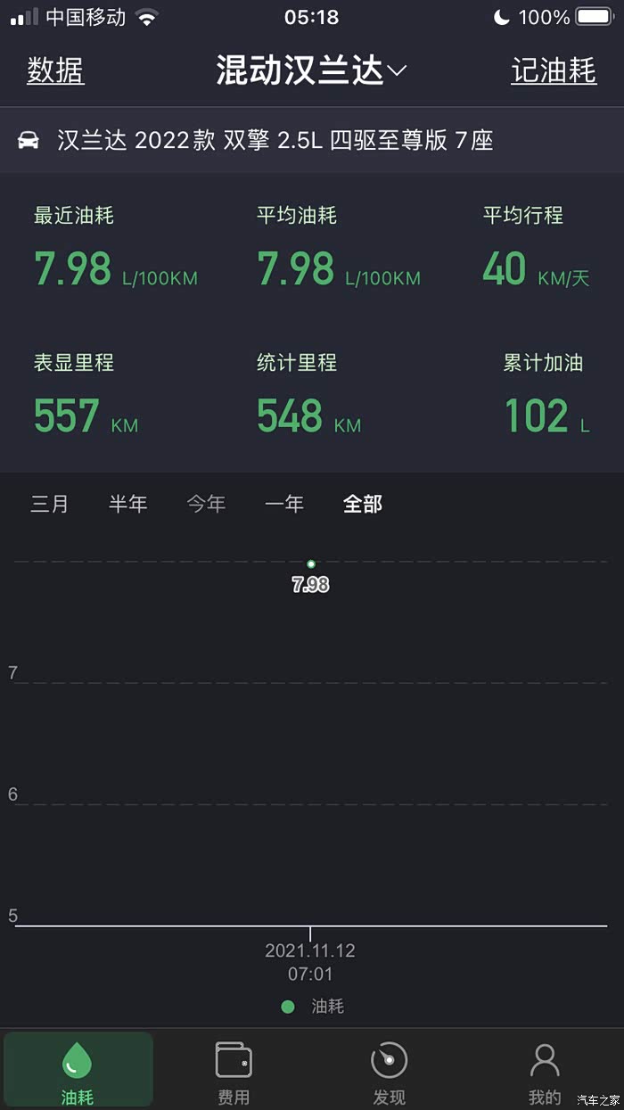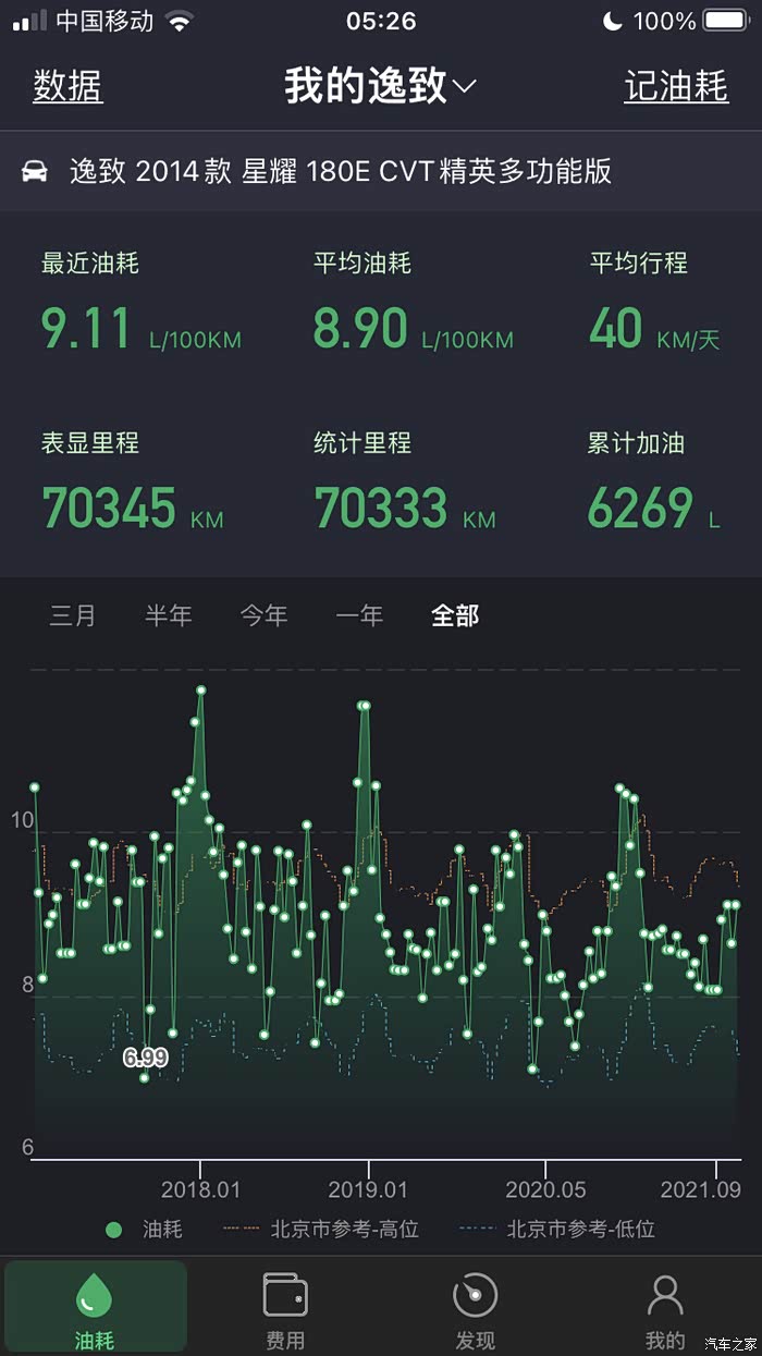 下面是我前一辆车逸致的油耗,比汉兰达还高一些,1.8自吸 cvt。