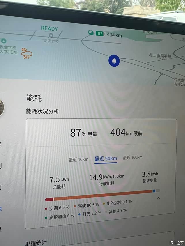 温度高满电开空调开舒适模式轻轻松松400+公里,功耗15kw左右,从岳阳到长沙高速能跑一个来回,因为没有热泵空调,温度低开暖风空调功耗就会比较高,