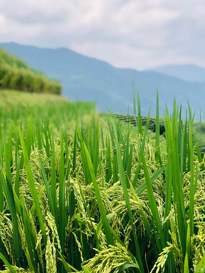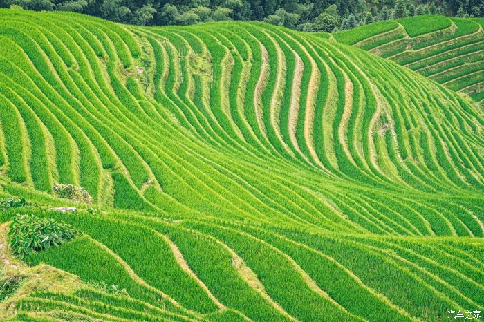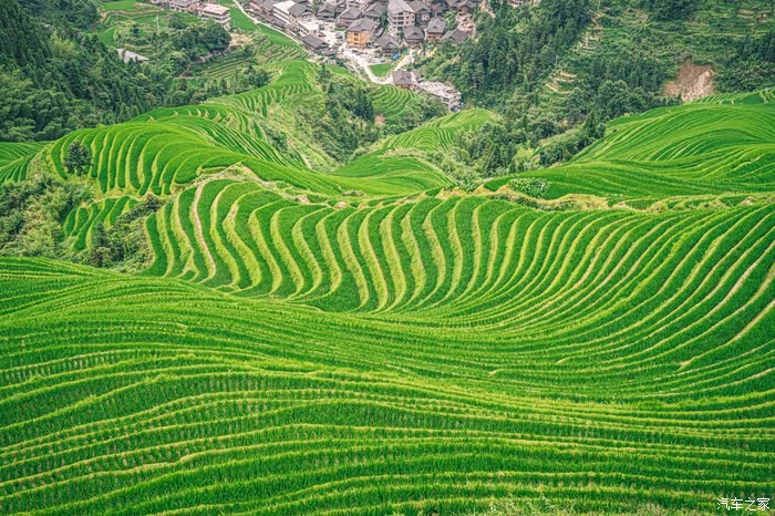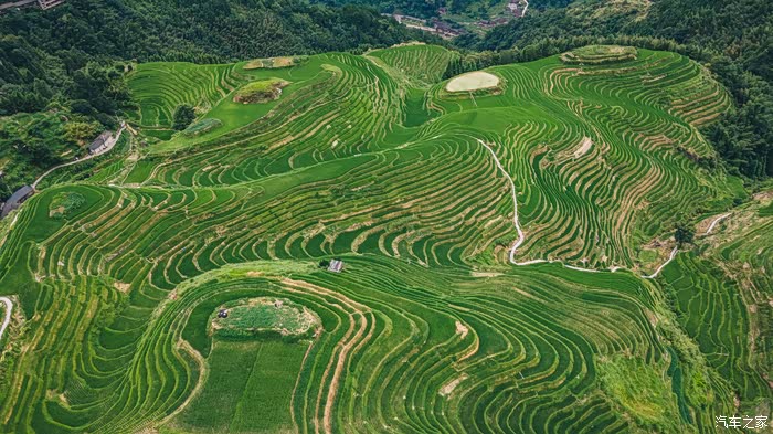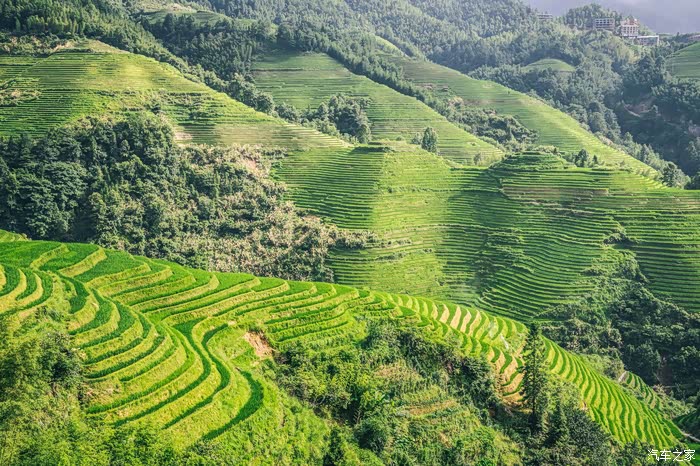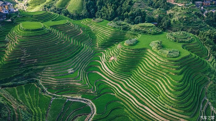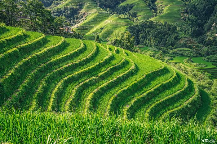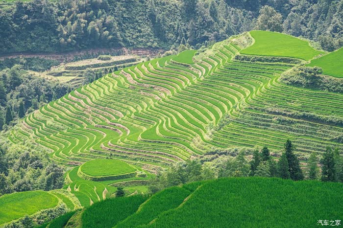 梯田绿油油、一片片如链似带,把一座座山峰环绕成一只只巨大的螺蛳,行走在山间,感觉真是郁郁葱葱,有的像巨扇一样半摺半开,斜叠成一个个狭长的扇;有的则像天镜被分割,然后有层次地镶嵌成多种图形的碎块,