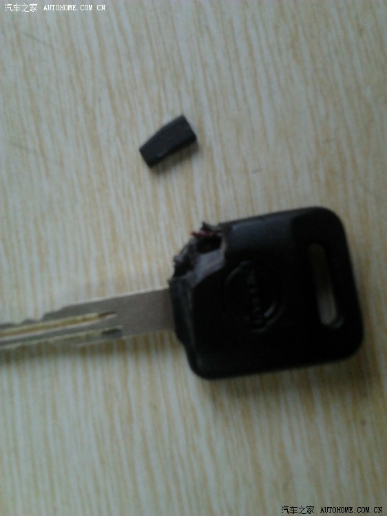 在钥匙上面有个深红色的位置,那里面放置的就是防盗芯片,用菜刀拆开,可以取出芯片,