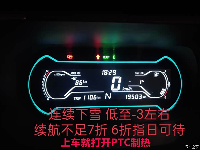 最差续航:实际行驶110KM,表显剩余85KM,合计195KM。这是三年来最差的一次,也就是去年冬天。连续多天都是雨雪天气,气温始终在0度以下,上车就打开PTC制热(绝对耗电大户),所以续航如此糟糕,平时冬天最差其实也在210KM以上。