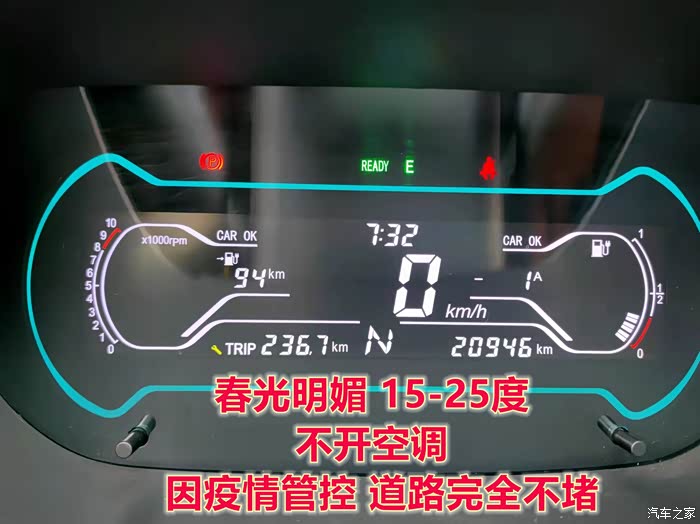 最佳续航:实际行驶236KM,表显剩余94KM,合计330KM。这是三年来最好的一次,也就是今年春天。气温适中,不用开空调,同时城区内也完全不堵,可以说是对电动汽车极其友好了。同时也可以看出经过这三年21000公里,我这台小蚂蚁的电池并没有出现明显的衰退。