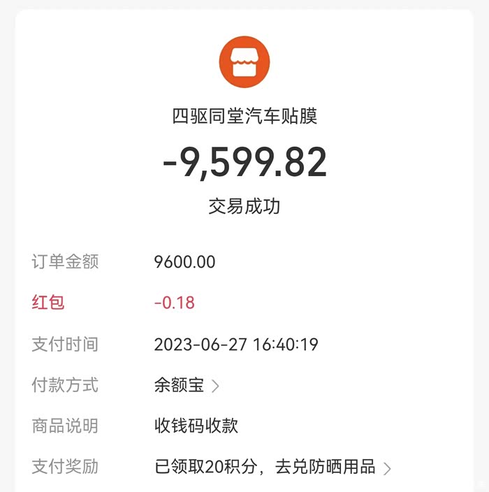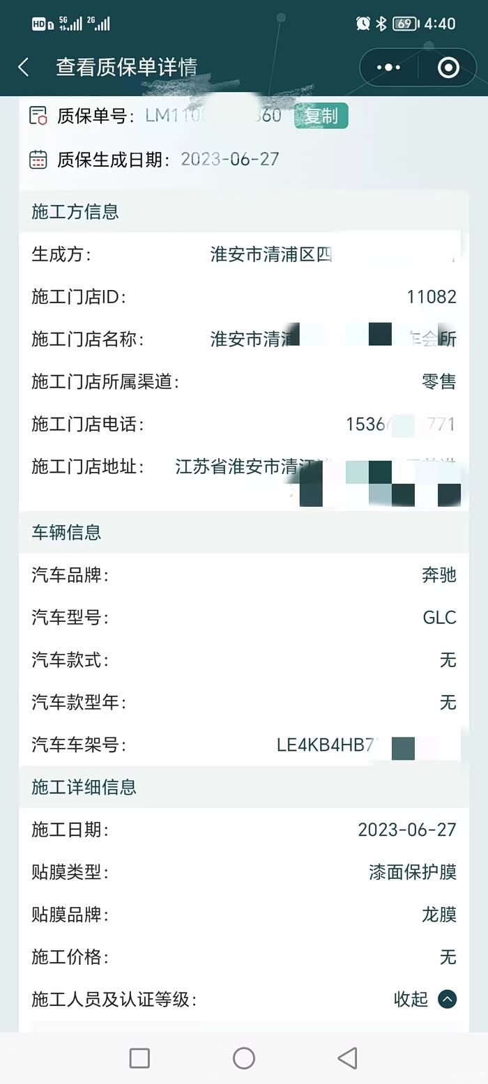 隐形车衣成分分为来个部分,4门车衣是买车时额外购买养车无忧PLUS赠送,而车辆其他部门就是去的本地汽车美容店选择的龙膜的G1系列,花费9600元。
