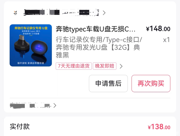 优盘是在某音上买的,带奔驰发光logo,32G内存,用的还是可以的,价格是138元。
