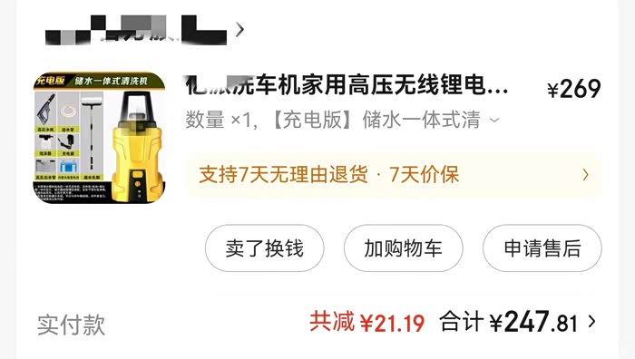 本人为了少玩手机多多运动,外加比较爱护新车,就算自己洗车,在全平台的搜索下,选择了充电储水一体式洗车机,还别说,挺好用的,如果清水洗,一车就够了,用洗车精要额外加水一次,充一次电可以洗3-4次,价格便宜,247.81元,解决了想自己洗车,住高层无水源的问题,还能锻炼下身体。