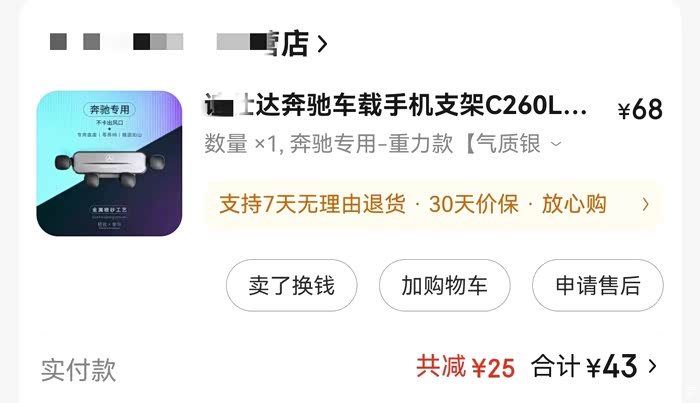 手机支架的选择也是花费不少时间,因为出风口喷气式飞机引擎的设计,不太好放手机支架,最后搜索各大平台并且借鉴C级轿车车友们的选择,拍了仪表盘式手机支架,蛮不错的,43元。唯独可惜的是不带无线充电,以前我的RX5可是华为专用无线快充支架。(再再次吐槽奔驰没有快充和前排点烟器!)